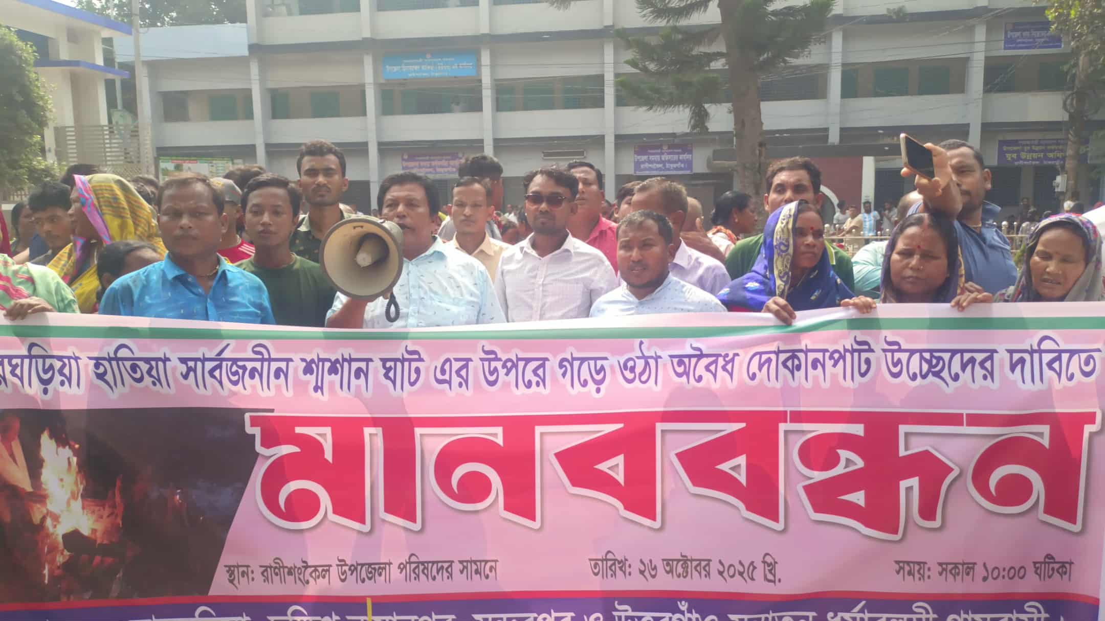 রাণীশংকৈলে শ্মশান ঘাটে অবৈধ দোকান-পাট উচ্ছেদের দাবিতে মানববন্ধন।