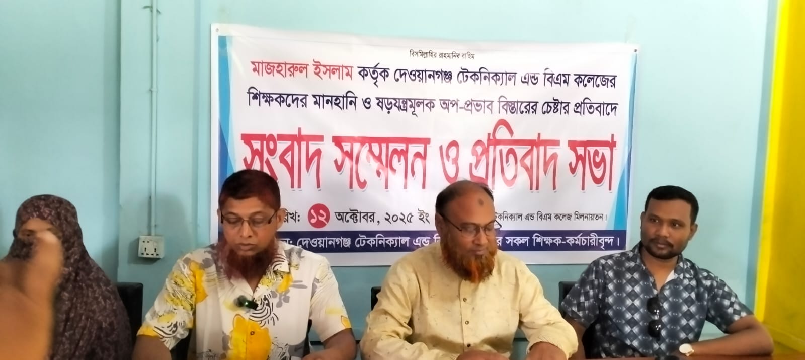 দেওয়ানগঞ্জ টেকনিক্যাল অ্যান্ড বি.এম কলেজের পক্ষ থেকে প্রতিষ্ঠান বিরোধী কার্যক্রমের প্রতিবাদে মাজহারুল ইসলামের বিরুদ্ধে সংবাদ সম্মেলন অনুষ্ঠিত হয়েছে। রবিবার (১২ অক্টোবর) সকালে কলেজ কার্যালয়ে আয়োজিত এই সংবাদ সম্মেলনে শিক্ষক, কর্মচারী ও শিক্ষার্থীরা উপস্থিত ছিলেন।