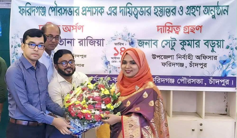 চাঁদপুরের ফরিদগঞ্জ পৌরসভায় প্রশাসক পদে দায়িত্বভার গ্রহণ করেছেন উপজেলা নির্বাহী কর্মকর্তা (ইউএনও) সেটু কুমার বড়ুয়া।
