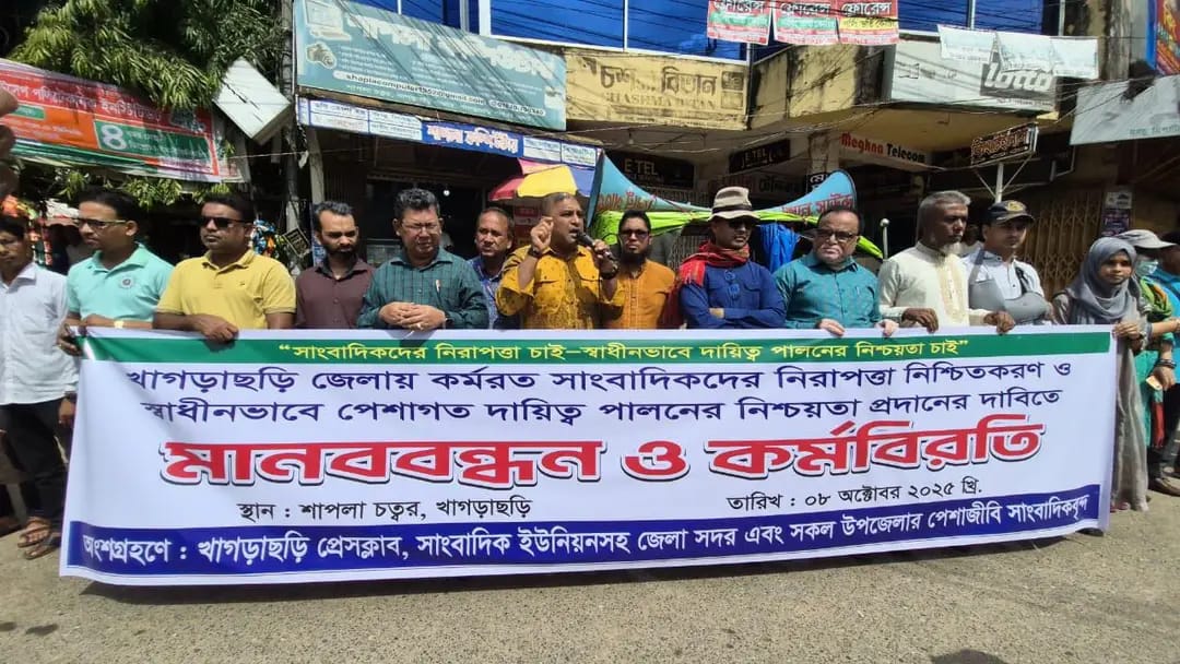 সাংবাদিকদের নিরাপত্তার দাবিতে খাগড়াছড়িতে মানববন্ধন ও কর্মবিরতি