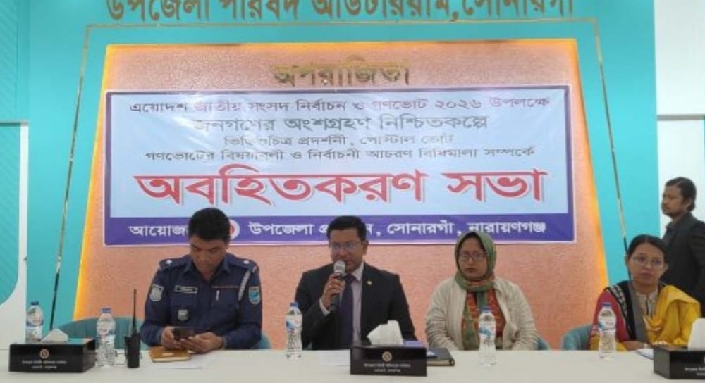 ত্রয়োদশ জাতীয় সংসদ নির্বাচন ও গণভোট উপলক্ষে ভোটারদের উদ্বুদ্ধকরণ এবং জনসচেতনতা বৃদ্ধির লক্ষ্যে নারায়ণগঞ্জের সোনারগাঁওয়ে একটি অবহিতকরণ সভা অনুষ্ঠিত হয়েছে। মঙ্গলবার দুপুরে উপজেলা প্রশাসনের উদ্যোগে উপজেলা পরিষদ অডিটোরিয়ামে এ সভা আয়োজন করা হয়।